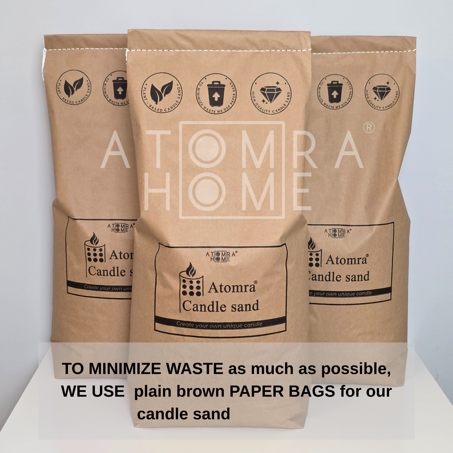 Pour minimiser autant que possible les déchets, nous utilisons des sacs en papier brun uni réutilisables et compostables pour notre cire de sable.